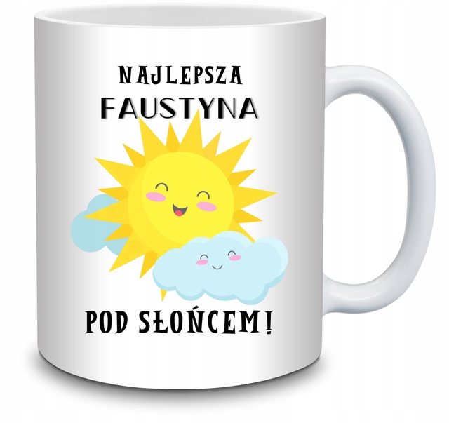 Kubek ze specjalnym nadrukiem dla Faustyny – idealny na prezent. Nadruk wykonany jest trwałą metodą sublimacji po obu stronach kubka.