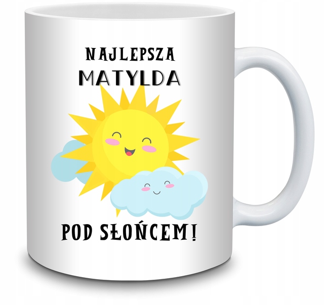 Kubek ze specjalnym nadrukiem dla Matyldy – idealny na prezent. Nadruk wykonany jest trwałą metodą sublimacji po obu stronach kubka.